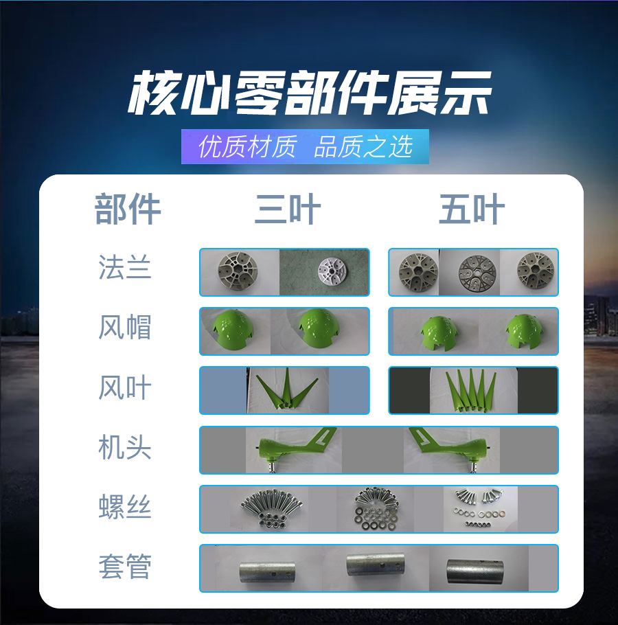 3、風葉采用高強度復合材料,強度高,韌性好,防紫外線,防腐蝕,抗大風,具有良好的氣動性能。